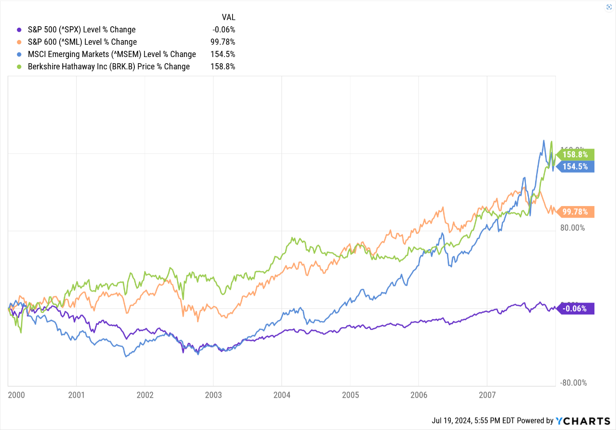 The following chart is an illustration of this. As you can see, in the seven years it took for the S&P 500 (purple line) to recover, these other areas of the market did much better. This illustrates the critical importance of diversification. Especially when the market gets as concentrated as it is today.